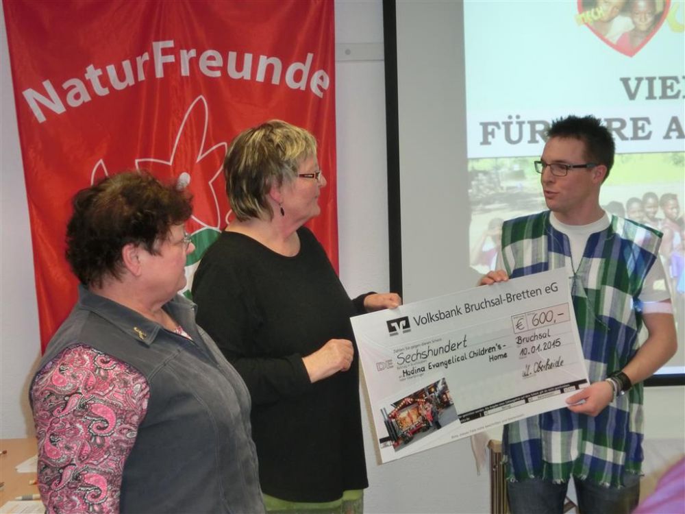 Am Samstag, den 10.01.2015 um 16 Uhr, werden die Naturfreunde Bruchsal im Rahmen eines Vortrags von Alexander Lauber einen Scheck an den Förderverein überreichen. Auch die Naturfreunde hatten einen gemeinnützigen Stand auf dem Bruchsaler Weihnachtsmarkt und haben sich in diesem Jahr unseren Förderverein zur Unterstützung ausgesucht.