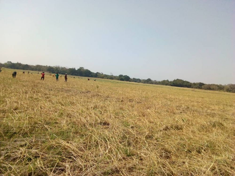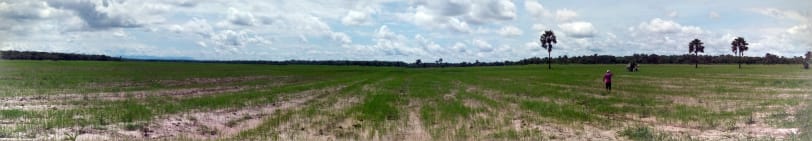 Bevor nun die bereits eingekauften Düngemittel auf die Farm kommen, geht es darum, das Feld vom Unkraut zu befreien, sodass sich der Reis ohne Einschränkungen entwickeln kann.