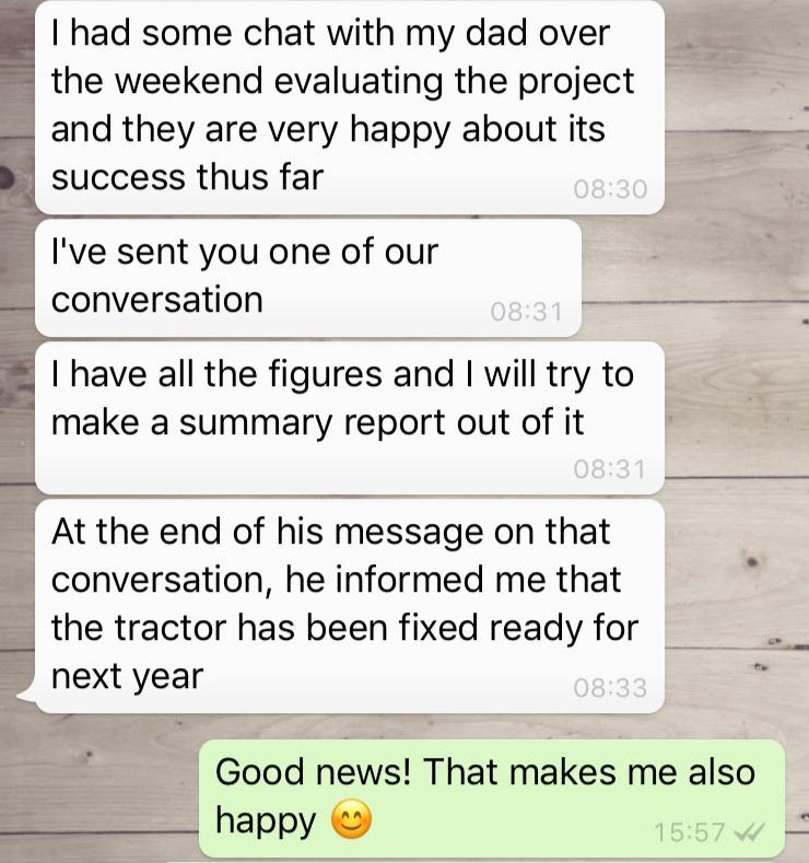 In einem Gespräch zwischen Paul Bangura, Alexander Lauber und Sebastian Wenz am 5. Mai 2020, teilte uns Paul mit, dass alle Aktivitäten derzeit nach Plan verlaufen. Es gebe keine größeren Herausforderungen. Es sei lediglich schwierig, genug Farmarbeiter zu finden, weil momentan alle Farmer ihre Felder bestellen und die Nachfrage nach Arbeitskraft entsprechend hoch ist. Nichtsdestotrotz, genau zwei Jahre nach Beginn des Projektes freuen wir uns sehr über die positive Entwicklung und den Erfolg!