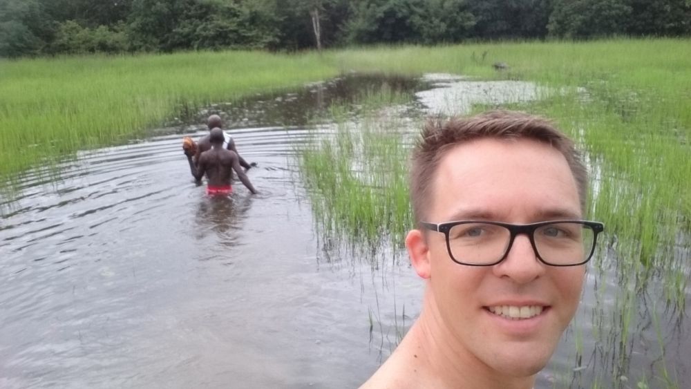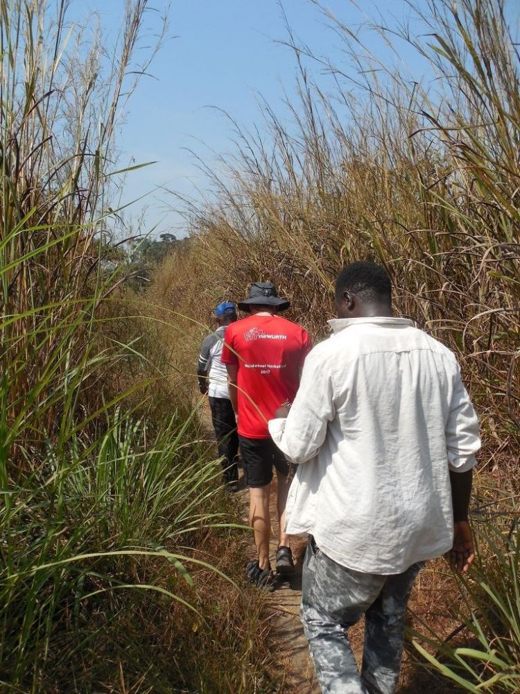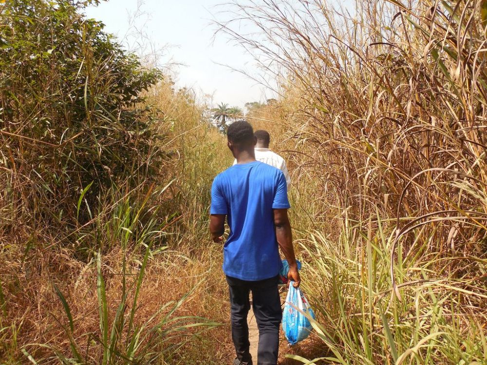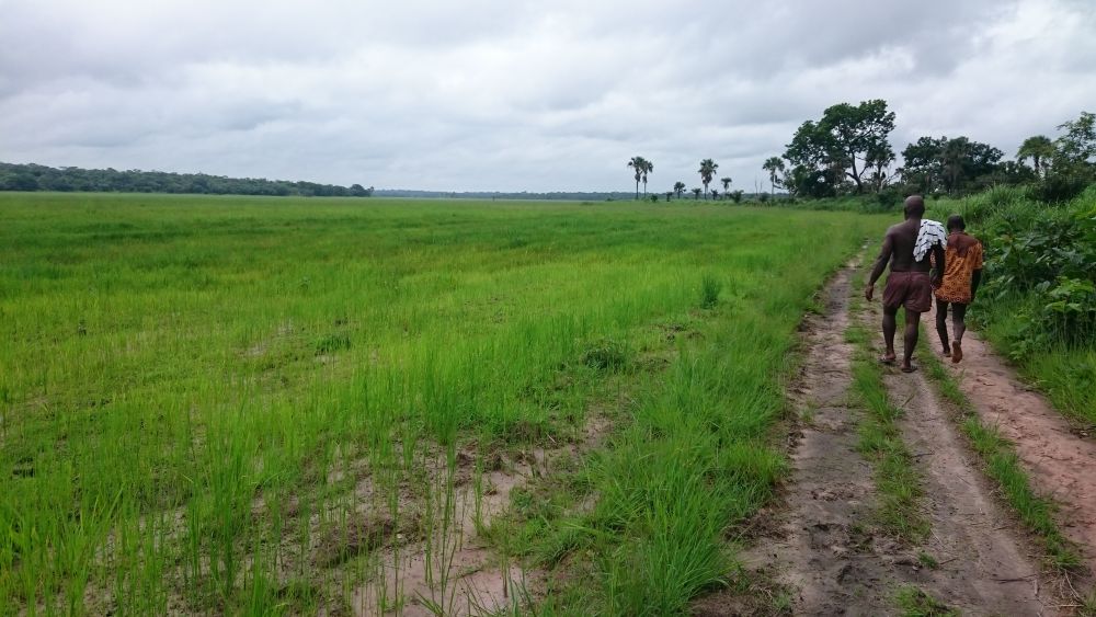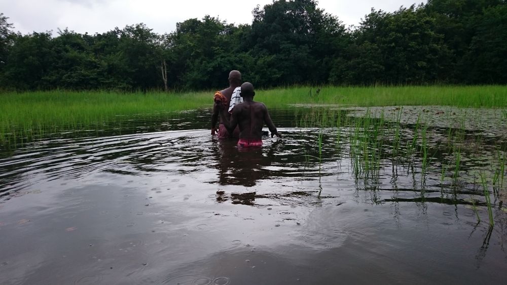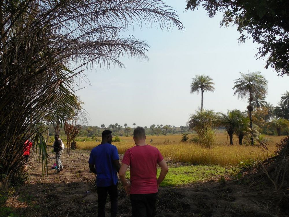 Während seines Besuchs am Waisenhaus fuhr Alexander mit Herrn Bangura zur etwa eineinhalb Stunden entfernten Reisfarm, wo sie zusammen mit einem Arbeiter einen Fluss, der in der Regenzeit am Zugang zur Reisfarm entsteht, durchqueren mussten. Nach wenigen Metern Fußweg erreichten die drei die Reisfarm und Alexander bekam den aktuellen Stand des Reisanbauzyklus erklärt und gezeigt, wo überall der Reis wächst und wie groß das Feld ist.