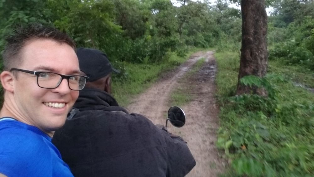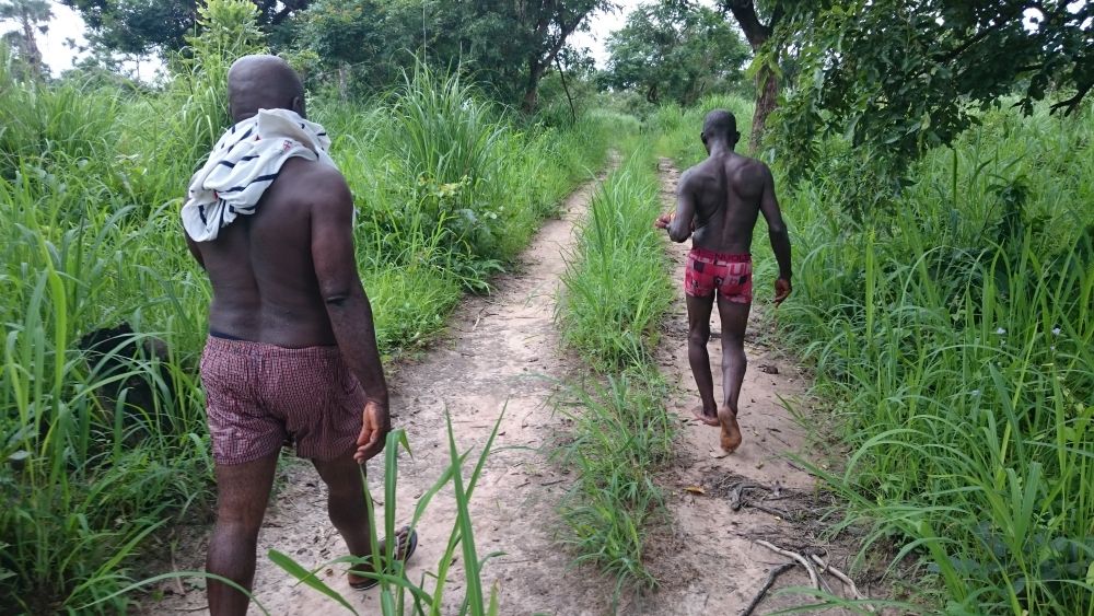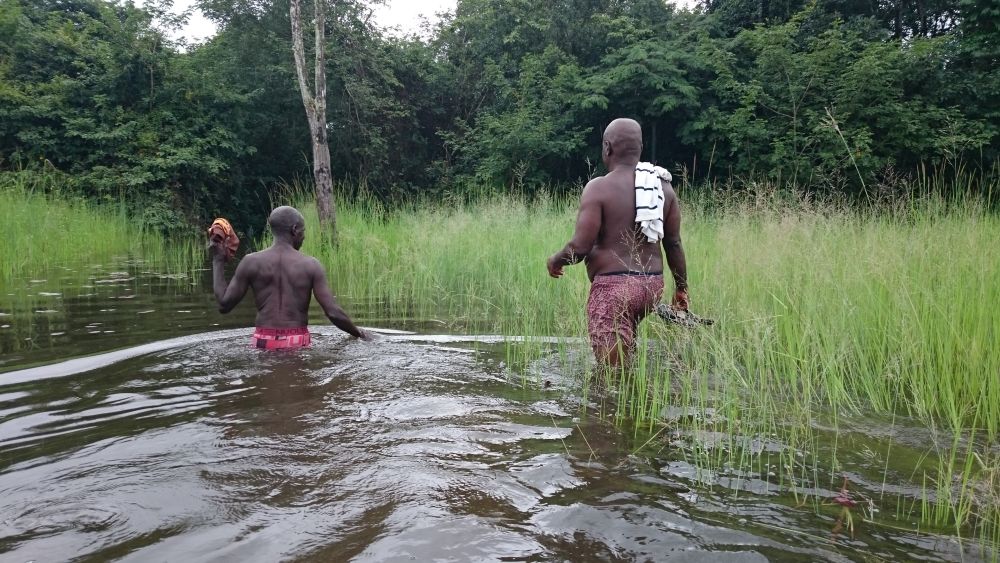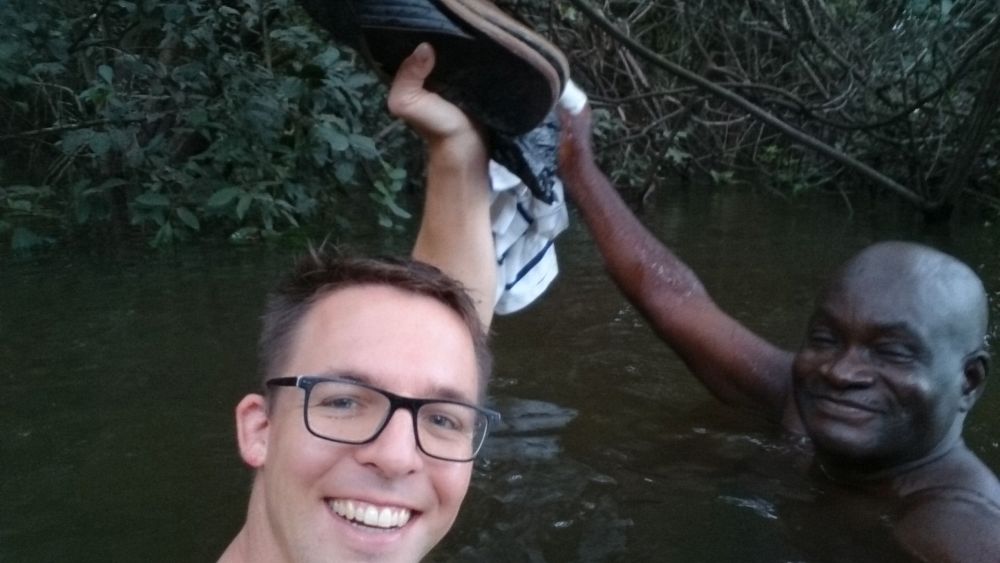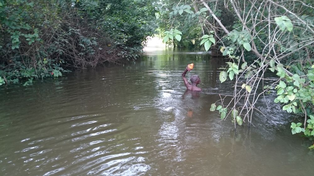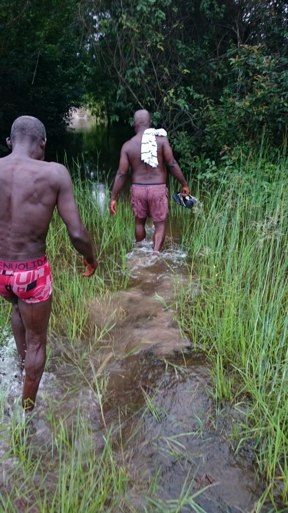 Während seines Besuchs am Waisenhaus fuhr Alexander mit Herrn Bangura zur etwa eineinhalb Stunden entfernten Reisfarm, wo sie zusammen mit einem Arbeiter einen Fluss, der in der Regenzeit am Zugang zur Reisfarm entsteht, durchqueren mussten. Nach wenigen Metern Fußweg erreichten die drei die Reisfarm und Alexander bekam den aktuellen Stand des Reisanbauzyklus erklärt und gezeigt, wo überall der Reis wächst und wie groß das Feld ist.
