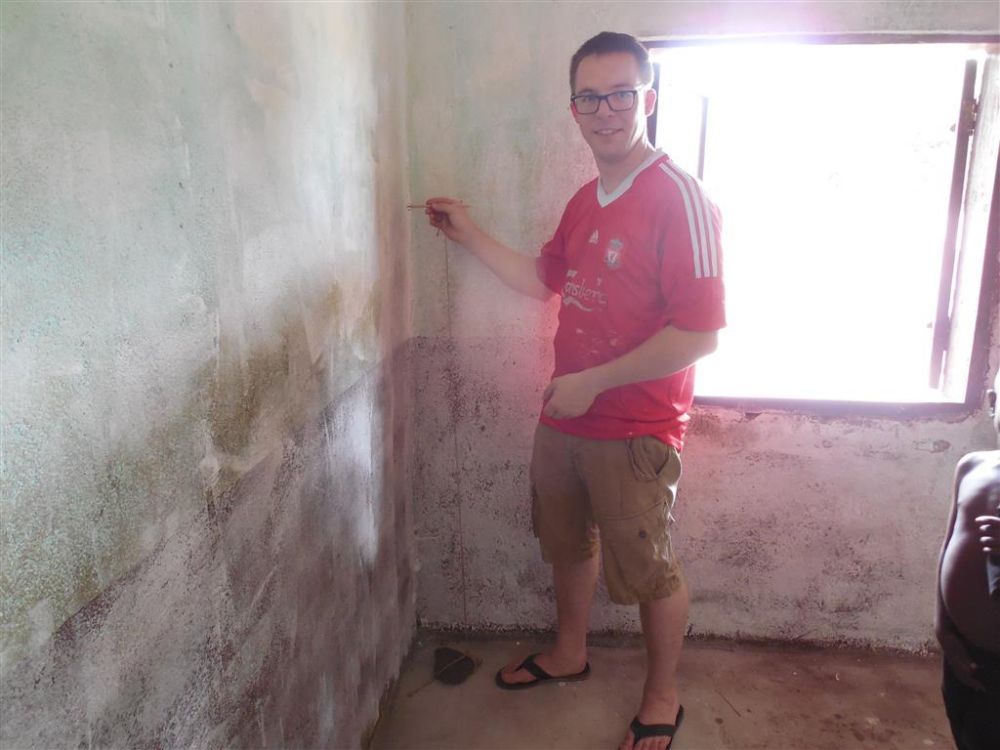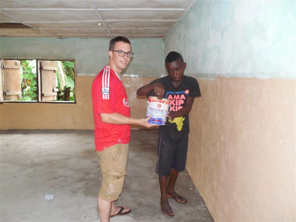 Gesagt getan, wir kauften also noch vor meinem ersten Besuch am Waisenhaus eine ockerfarbene Ölfarbe, mit der wir das Streichen beginnen wollten. In Sierra Leone wird für den Bereich vom Fußboden aufwärts üblicherweise immer Ölfarbe genutzt. Hauptgrund hierfür ist die feuchte Regenzeit, gegen welche die Ölfarbe einen gewissen Schutz für das Mauerwerk darstellt. Ein weiterer Vorteil ist, dass die mit Ölfarbe bestrichene Wand mit einem feuchten Tuch abgewischt werden kann. Gerade in einem Klassenzimmer kann das durchaus einmal nötig sein, weshalb wir die Höhe derselben auf etwa 1,50m steigerten. Darüber sollte die ursprüngliche hellgrüne Farbe erneuert werden und somit in neuem Glanz erstrahlen.